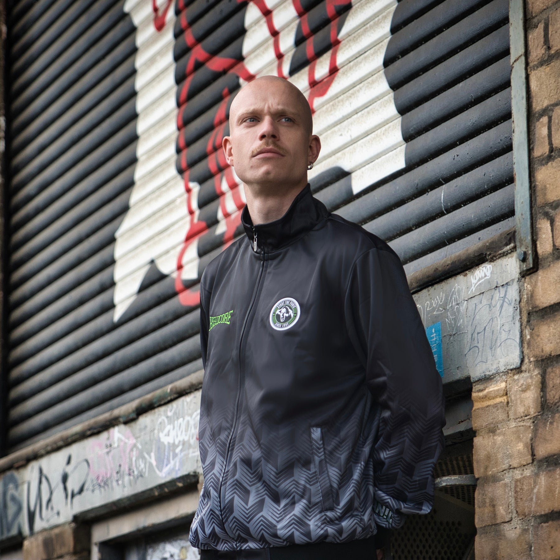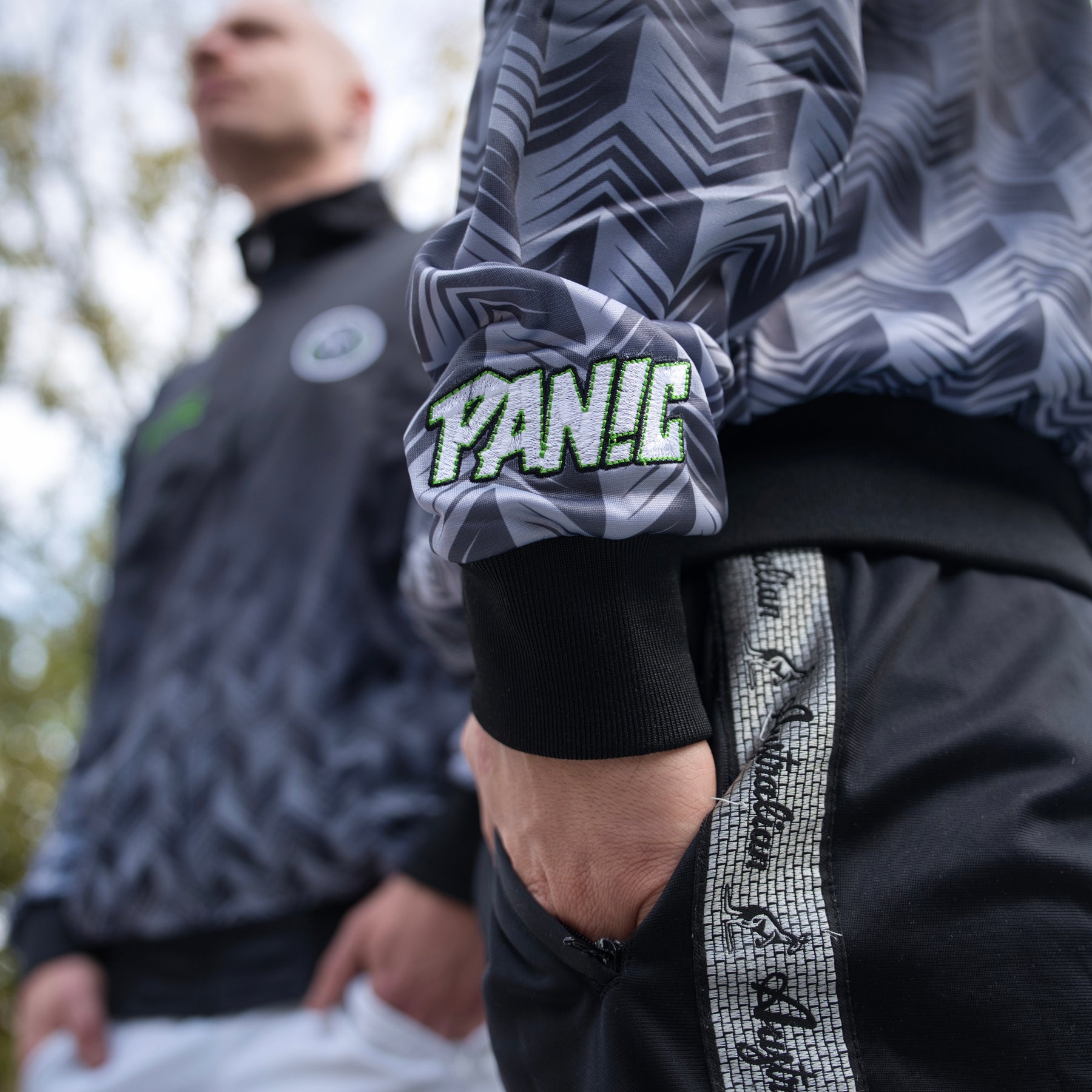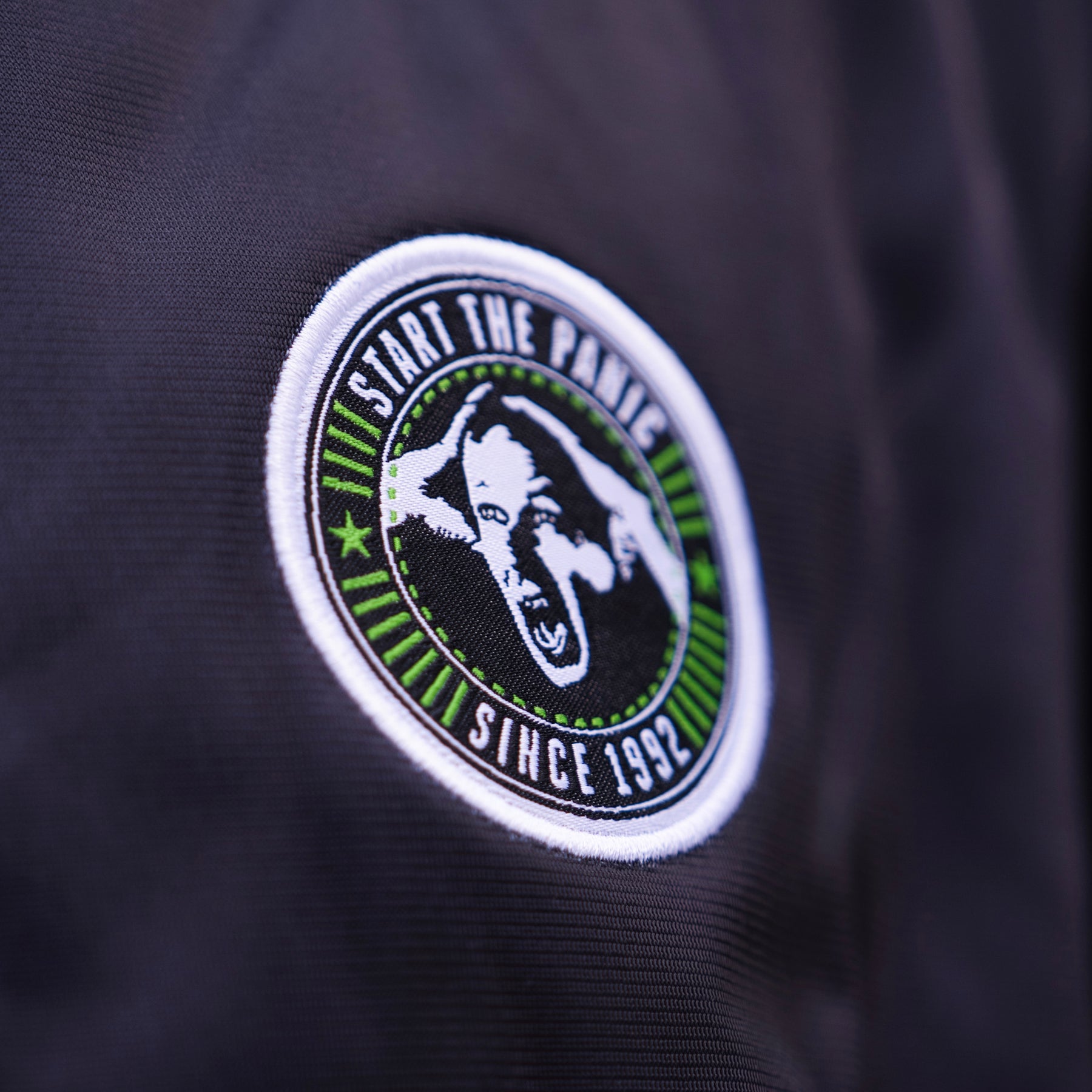 Opvallende groene Early Rave Addict -tekst op de achterkant, subtiel Panic-logo op de rits , een opvallende badge op de borst en een geborduurd logo op de mouw.